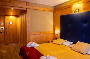 In questa camera trovi: finestra con vista montagna; bagno privato con doccia oppure vasca idromassaggio; asciugacapelli; accappatoio; ciabattine; prodotti da bagno; riscaldamento centralizzato; televisione satellitare; telefono interno; cassaforte; mini-frigorifero; connessione wi-fi.